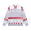 This sweater fuses vintage knit textures with contemporary streetwear aesthetics, creating a bold and fashion-forward look. The relaxed silhouette and eye-catching details—whether through contrast patterns or unique textures—add depth and character to any outfit. Pair it with denim or wide-leg trousers to effortlessly channel a laid-back yet confident style that’s equal parts trend and individuality.